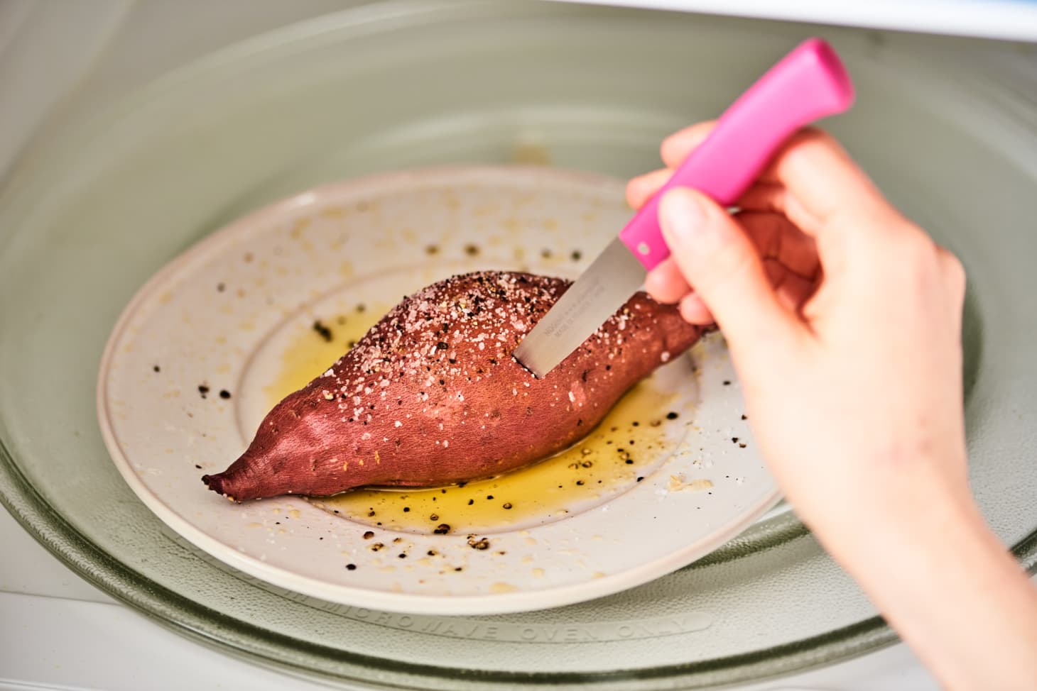 How to Cook a Sweet Potato in the Microwave | Kitchn from cdn.apartmenttherapy.info If cooking one potato, microwave for an additional 3 minutes. Do not be tempted to wrap each potato in aluminum foil as that will steam the how to cook bacon in the microwave. How to cook roast potatoes. Generously sprinkle the potatoes with salt and pepper. How long to boil baby potatoes in the microwave? I pierce them with a knife before butting them in. In theory, cooking two potatoes should take twice as long, but be cautious. Inspired by the other how to bake one thread, i always cook mine in a microwave.